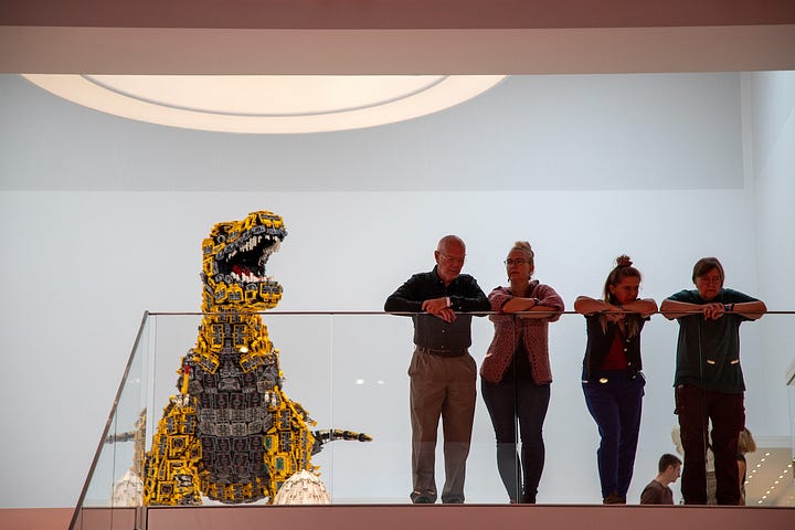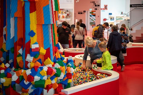 What struck me wasn’t just the spectacle but the posture of everyone inside. Children, parents, grandparents, all leaning forward, heads bent toward piles of bricks. It felt less like play than a ritual: the human urge to take what is scattered and make it whole.