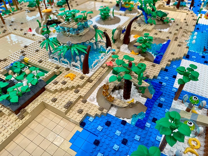 Downstairs, the nostalgia was overwhelming. A museum of what seemed like every LEGO set ever produced lined the walls, arranged by year, each box glowing in its alcove. I recognized the pirate ship I begged for but never got, the spaceship I built and rebuilt, even the island retreat I once showed my mom with pride. The nostalgia was undeniable, but so was the contrast. Upstairs, people were improvising habitats for sea turtles. Down here, the boxes told you exactly what to build.