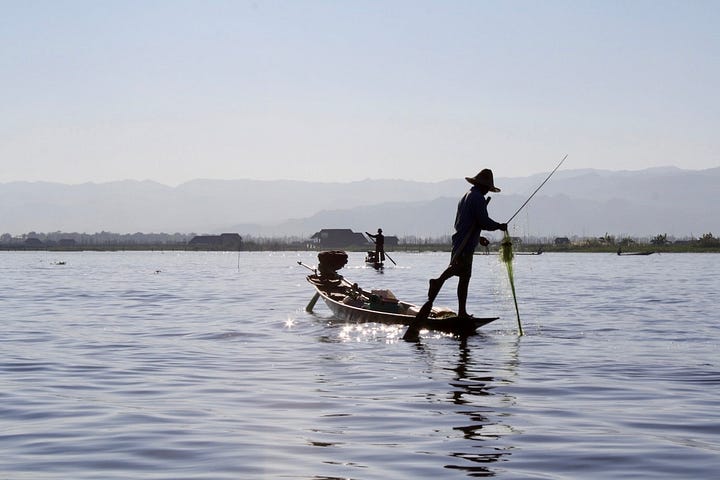 We hired a boat, long and narrow, the driver crouched at the stern as the motor pushed us out into open water. Fishermen balanced on one leg at the prow of their skiffs; the other leg wrapped around an oar in a rhythm that looked impossible until you saw how naturally they did it. Nets dipped and rose. Ripples spread in perfect circles, vanishing back into the lake as if nothing had happened at all. Larkin had written of people carrying truths quietly, hidden in gestures. Watching the fishermen’s rhythm, I wondered if this balance was another form of survival.