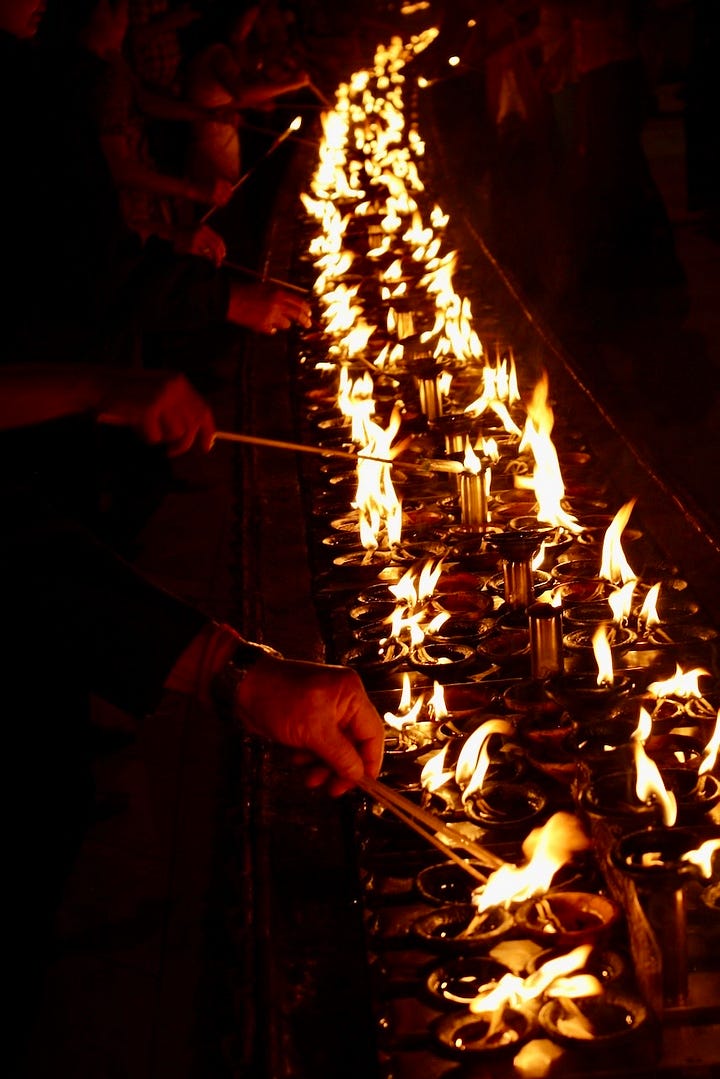 We joined the crowd before dusk, climbing barefoot past prayer halls and smaller shrines until the stupa itself filled the sky. Up close, it was less like a building and more like a sun: gold leaf stacked into a mountain, glowing against the night. People drifted slowly together, candles balanced in their hands. Some muttered prayers. Others simply stared upward, necks tilted at the impossible slope of it.