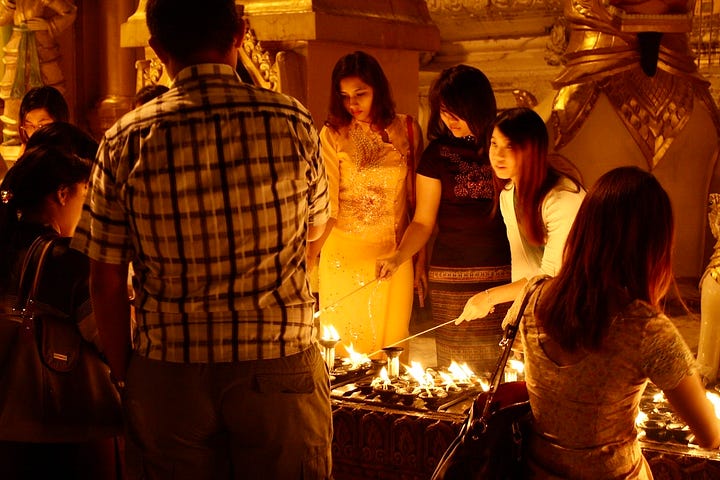The buzz of the New Year hung in the air. Not loud, not festive, but as something building quietly toward release, as if this might be the year. Shwedagon Pagoda was where we decided to spend it. Not in a hotel bar like the few foreigners scattered across the city, but at the golden stupa that anchored Yangon. If you wanted to start a year with meaning, you went there.