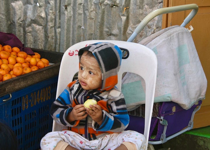 I wandered with my friend. He usually walked a few paces ahead while I steadied my camera on details: a doorway closed and peeling, children with golden sunscreen streaks of thanaka on their cheeks. Yangon wasn’t a place you attacked with an itinerary. It was a place you drifted through. It was quiet so you could travel by sound: listening to the crackle of frying oil, the sharp kisses waiters used to summon one another in teahouses, the steady chanting of monks. Sometimes we stopped to chat with shop owners or thumb through books pages curled by the humidity. Conversations were careful, like Larkin described, but they carried weight in what they didn’t say.
