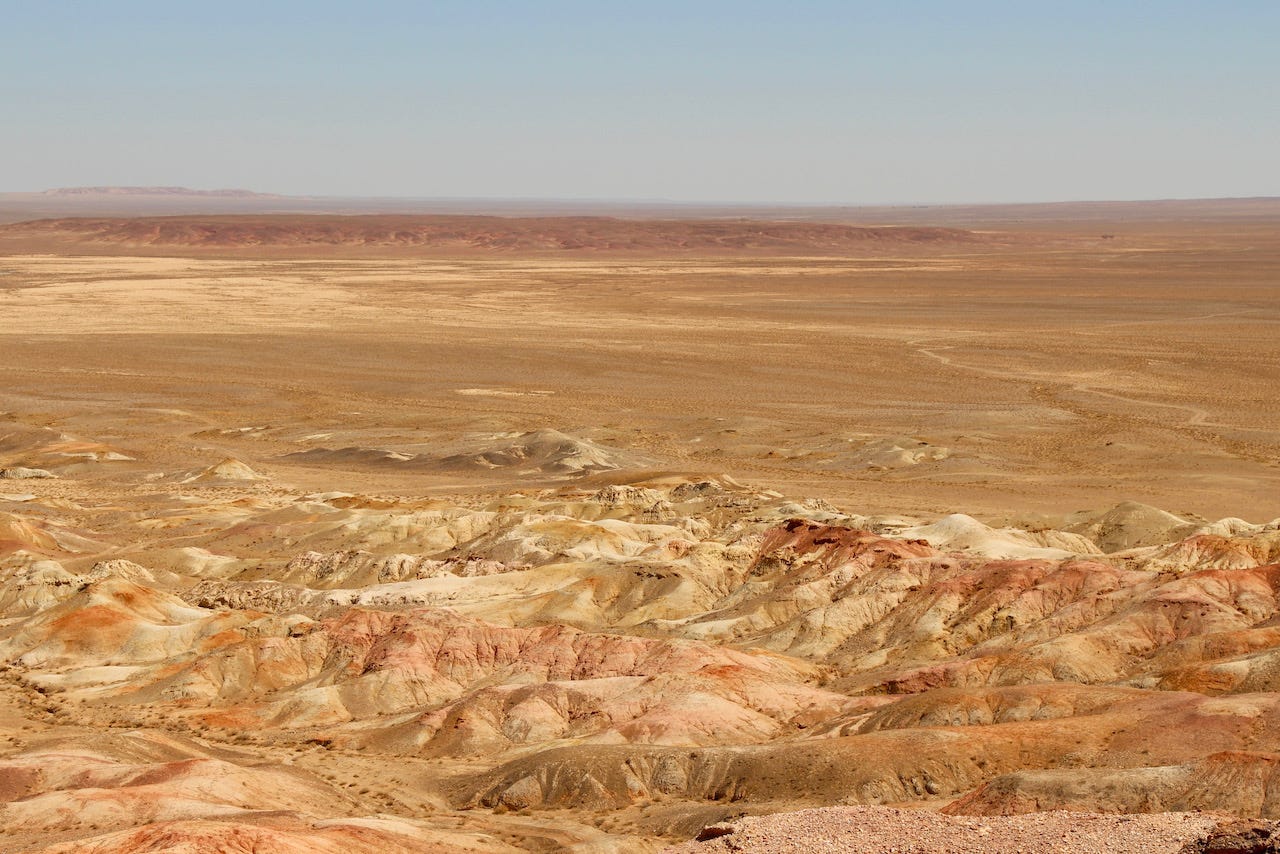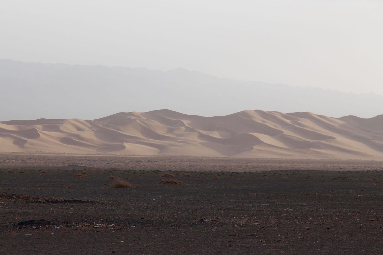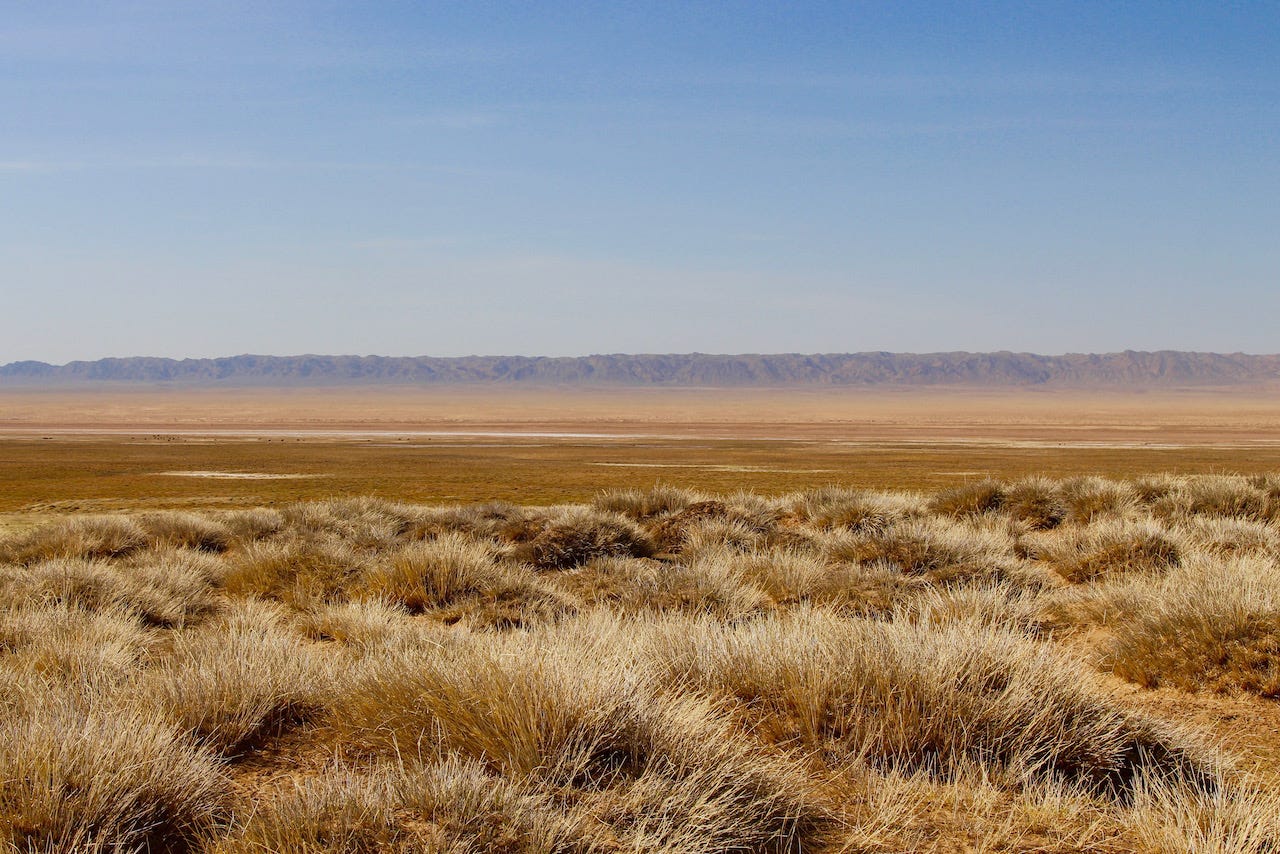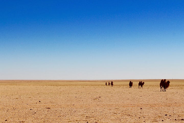 We arrived in the south, near Dalanzadgad, and before long, the road gave out, the pavement disappeared, and the open steppe began. For the next seven days, we drove across southern and western Mongolia —a region about the size of Texas— without seeing a single sign. Sometimes there was a dirt path or tire tracks in the sand. Mostly, there was nothing. Just land and sky.