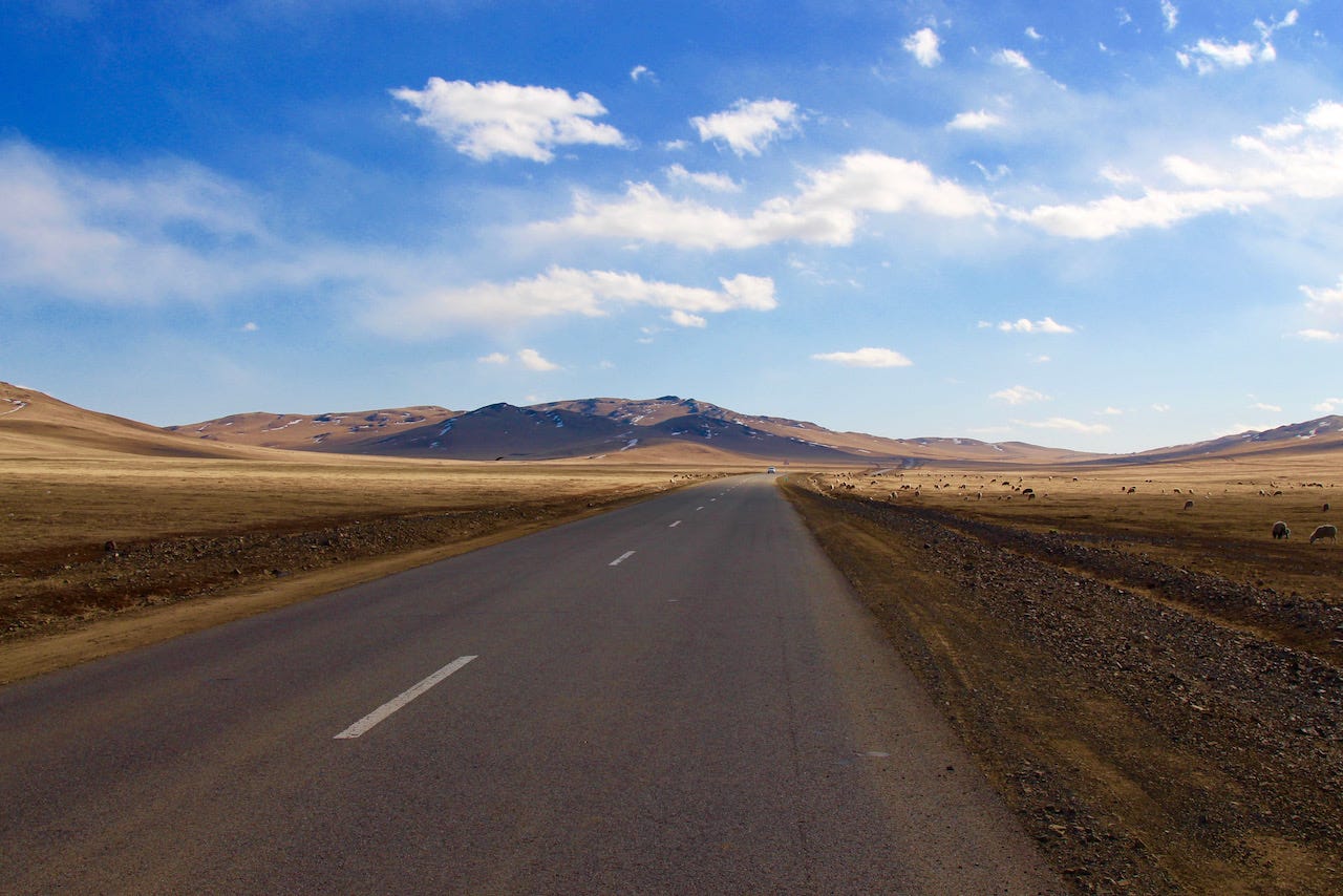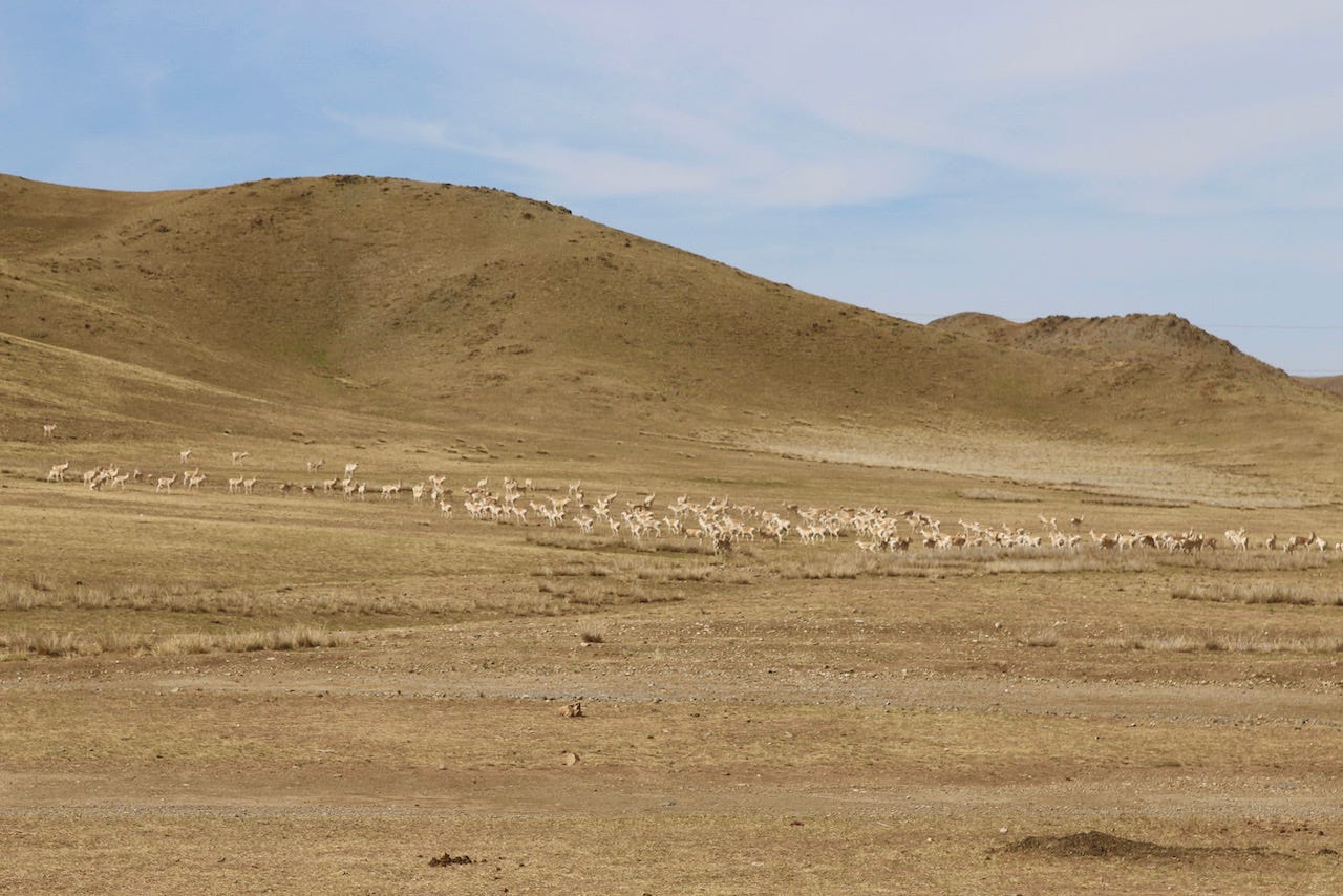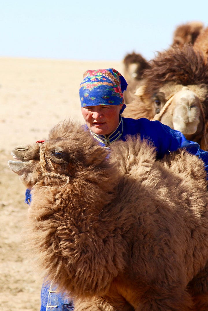 We arrived in the south, near Dalanzadgad, and before long, the road gave out, the pavement disappeared, and the open steppe began. For the next seven days, we drove across southern and western Mongolia —a region about the size of Texas— without seeing a single sign. Sometimes there was a dirt path or tire tracks in the sand. Mostly, there was nothing. Just land and sky.