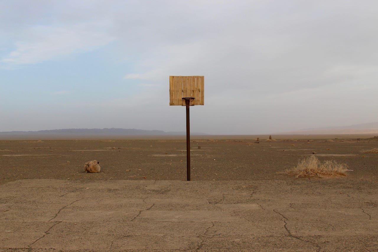 For the first few days, I tried to keep track, to orient myself in the void. I watched the horizon like it might offer clues. Sometimes it did. We’d spot a distant motorbike or the silhouette of a camel. Other times, we’d pass a rusted basketball hoop with nothing around it, just standing there like a prop in a set. The towns were small, if you would call them towns at all. Then, more nothing.