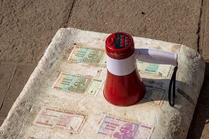 Old Zimbabwean banknotes, from millions to trillions, sold as collectibles.