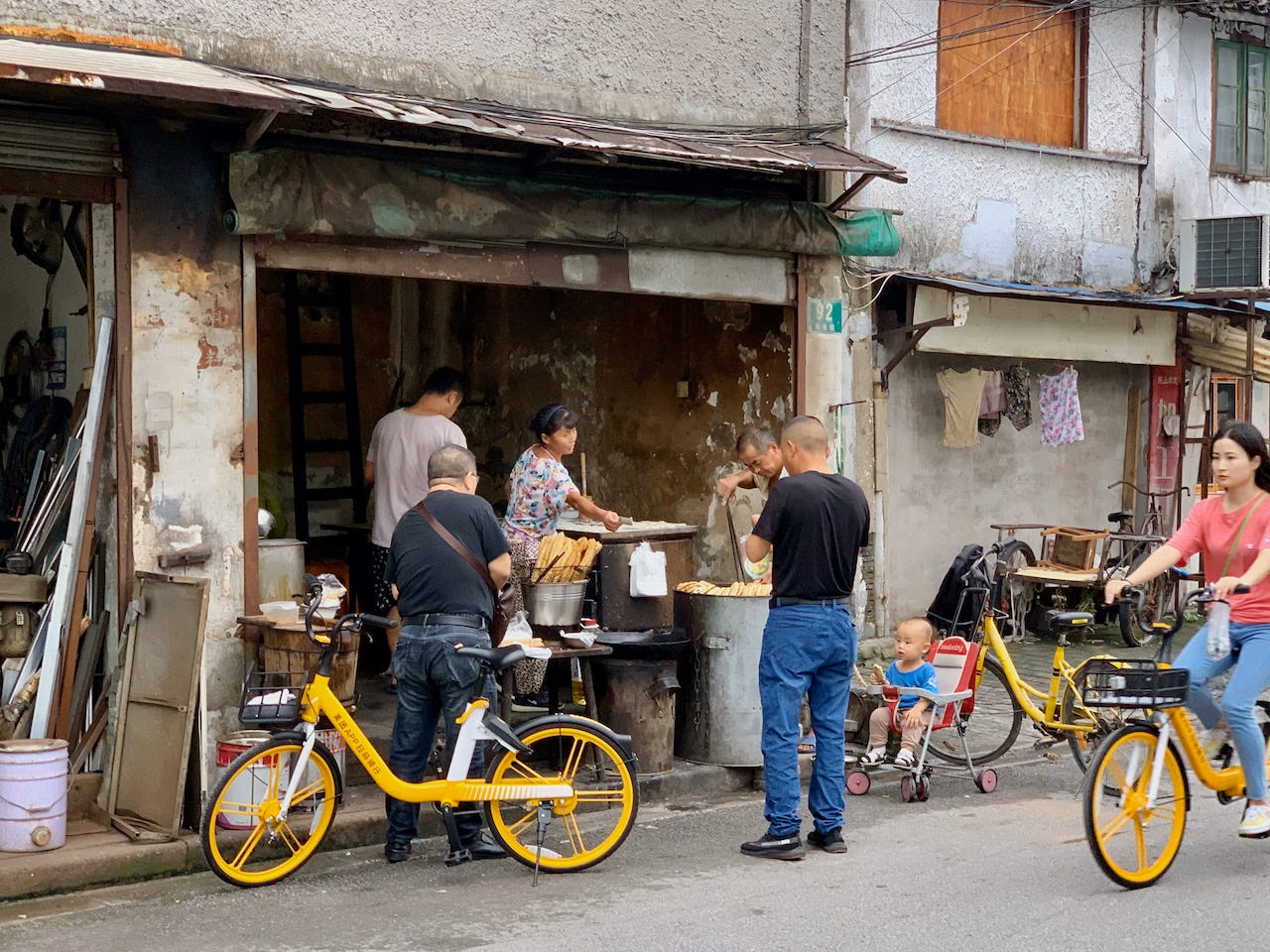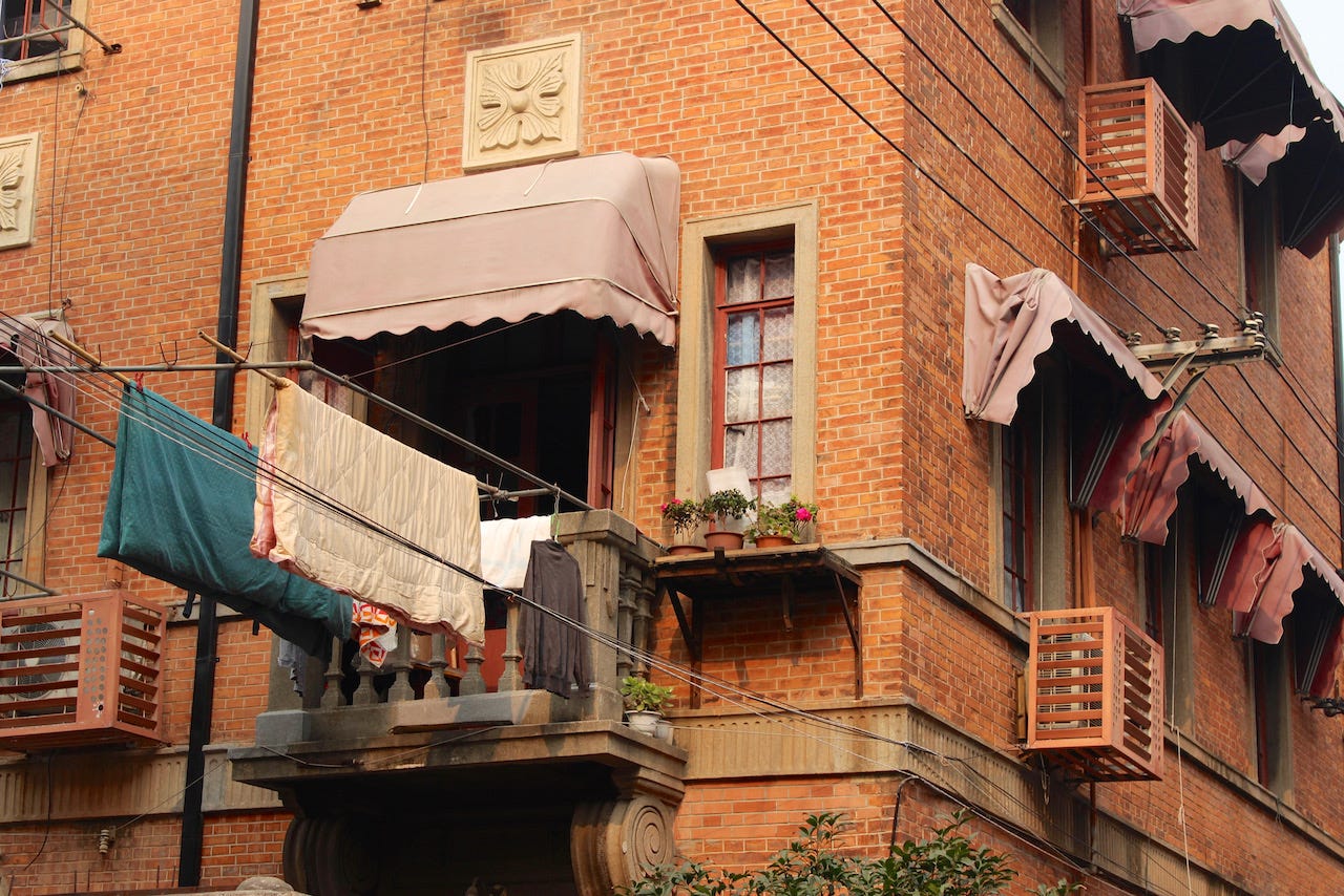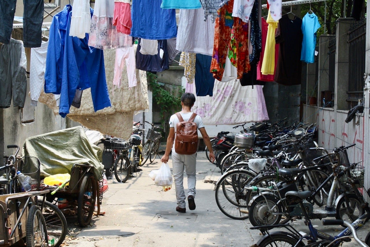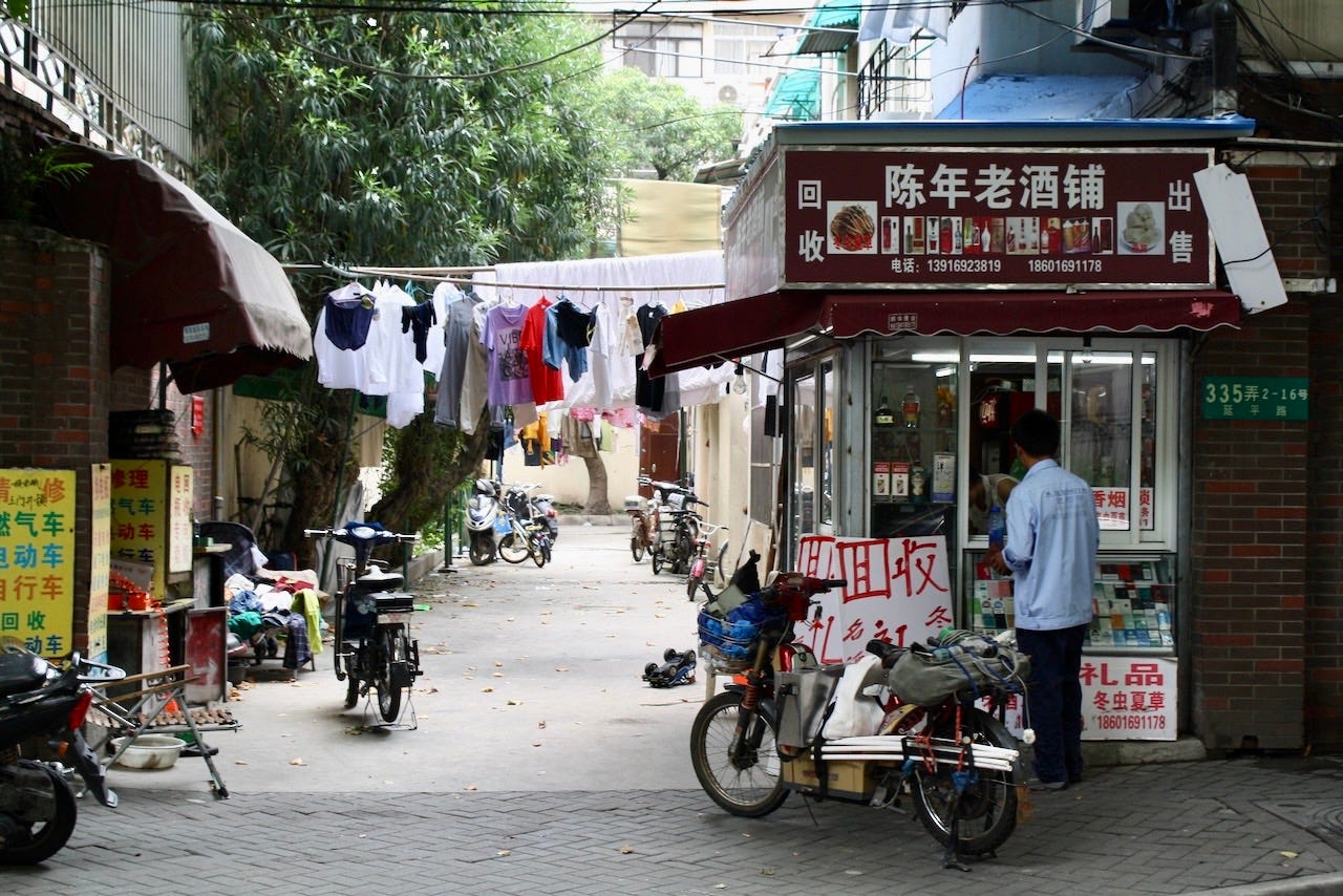 My Shanghai wasn’t found in glitzy new shopping districts. I preferred its backstreets, especially the old shikumen neighborhoods: crumbling lanes of orange-brick homes and clotheslines that stretched like prayer flags from one window to the next. These were the lungs of the city, where people played mahjong in the alley, where you could smell dinner before you saw the kitchen, and where the rhythms of life —arguing, bargaining, repairing bikes— never paused, even as bulldozers waited just around the corner.